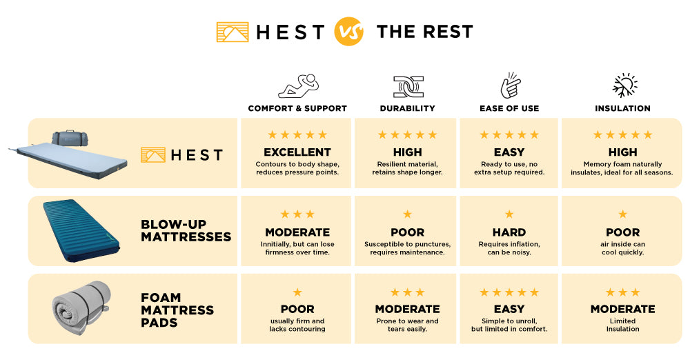We designed and built the most comfortable camping mattresses, sleeping pads and pillows with enhanced memory foam that takes all the best things from your home bed and packaged it up into a portable, deluxe experience for under the stars.Â